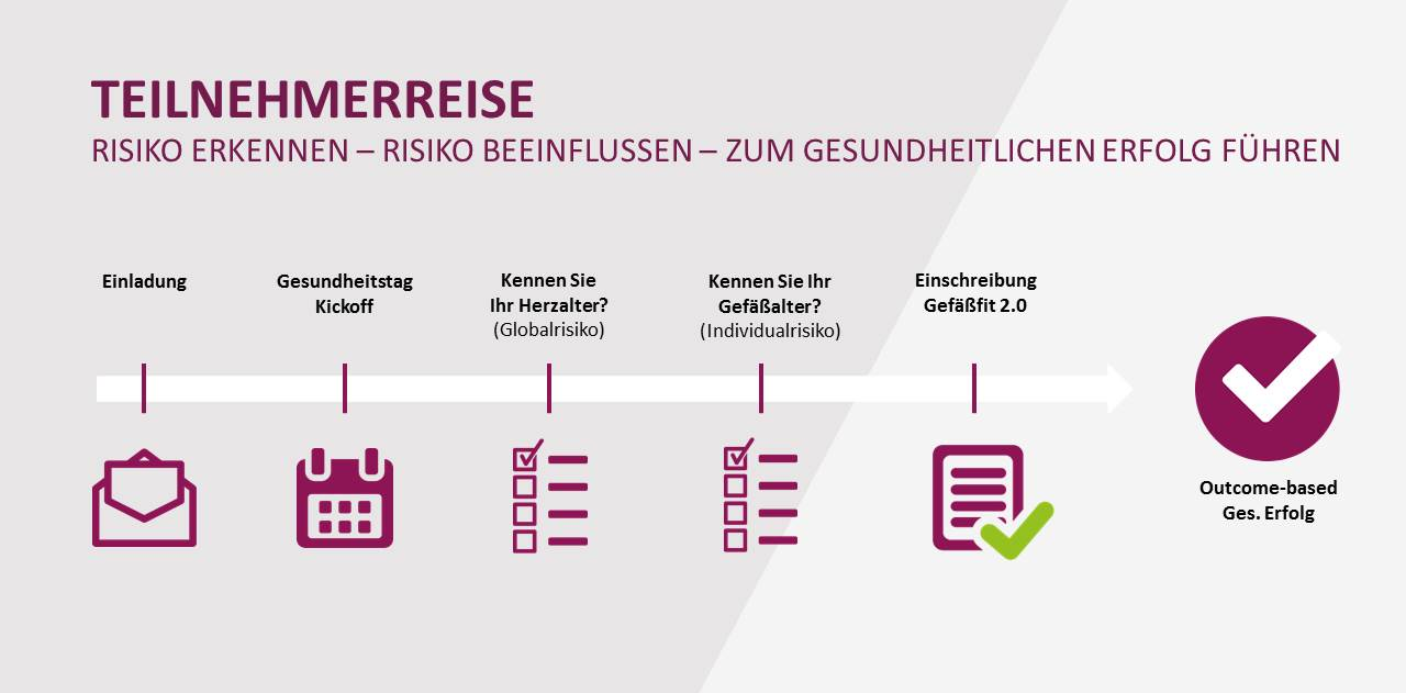 Mit einem Vortrag zum Thema Herz-/Kreislaufgesundheit oder einer sog. 'Gefäßaltermessung' auf Ihrem Gesundheitstag wird das Interesse geweckt. Eine Einladung zur Teilnahme an dem Gefäßfit-Programm mit Kickoff-Termin dient der Kommunikation der Teilnahmebedingungen und des Programmablaufs.