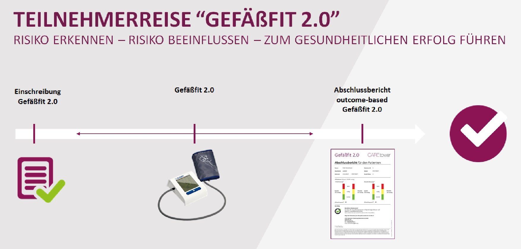 Die individuelle Messung der arteriellen Gefäßsteifigkeit und Hämodynamik gibt Auskunft über das Individualrisiko. Hier entscheidet sich, wie die weitere Reise verläuft. Im Idealfall altern die Gefäße normgerecht. Bei Auffälligkeiten und Identifikation eines hohen Risikos, ist die Einschreibung in das Interventionsprogramm Gefäßfit 2.0 zu empfehlen.